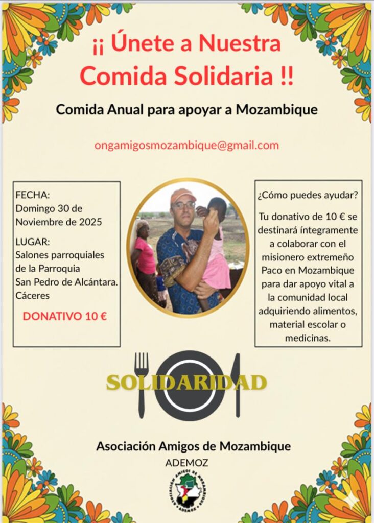 La Parroquia de San Pedro de Alcántara de Cáceres vuelve a unir comunidad y misión con una iniciativa que ya se ha convertido en tradición solidaria: la Comida Anual a favor de Mozambique, organizada por la Asociación Amigos de Mozambique (ADEMOZ). La cita será el domingo 30 de noviembre de 2025 en los salones parroquiales, con un donativo de 10 euros destinado íntegramente a los proyectos misioneros que la entidad sostiene en África.