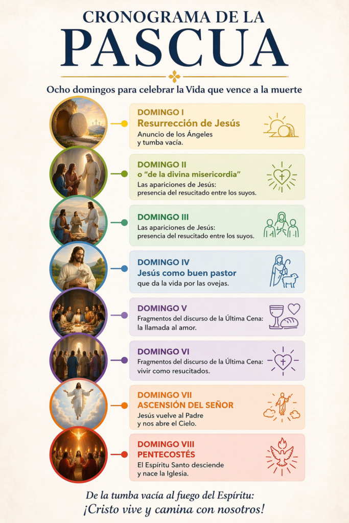 Comienza el Tiempo Pascual, los cincuenta días que van desde el Domingo de Resurrección hasta el Domingo de Pentecostés, que «se han de celebrar con alegría y júbilo, como si se tratara de un solo y único día festivo, como un gran domingo» (Normas Universales del Año Litúrgico, n 22).