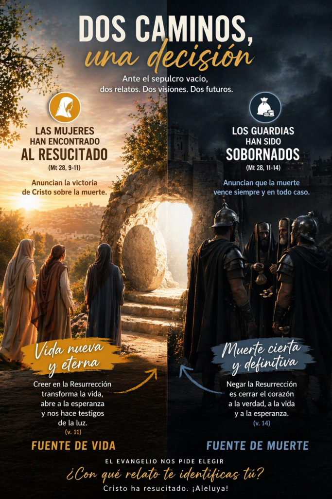 “Las primeras anuncian la victoria de Cristo sobre la muerte; los segundos anuncian que la muerte vence siempre y en todo caso. En su versión, Jesús no ha resucitado, sino que su cadáver ha sido robado. De un mismo hecho, el sepulcro vacío, brotan dos interpretaciones: una es fuente de vida nueva y eterna, la otra de muerte cierta y definitiva”.