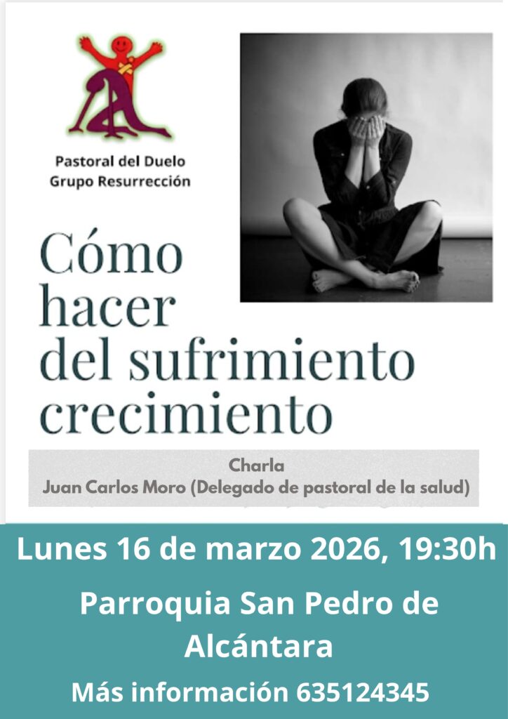 La parroquia San Pedro de Alcántara acogerá el próximo lunes 16 de marzo de 2026, a las 19:30 horas, una charla titulada “Cómo hacer del sufrimiento crecimiento”, una propuesta dirigida especialmente a quienes han atravesado la experiencia del duelo por la pérdida de un ser querido. La sesión estará impartida por Juan Carlos Moro, delegado de Pastoral de la Salud, dentro de la iniciativa pastoral de acompañamiento a personas que viven procesos de sufrimiento y pérdida.