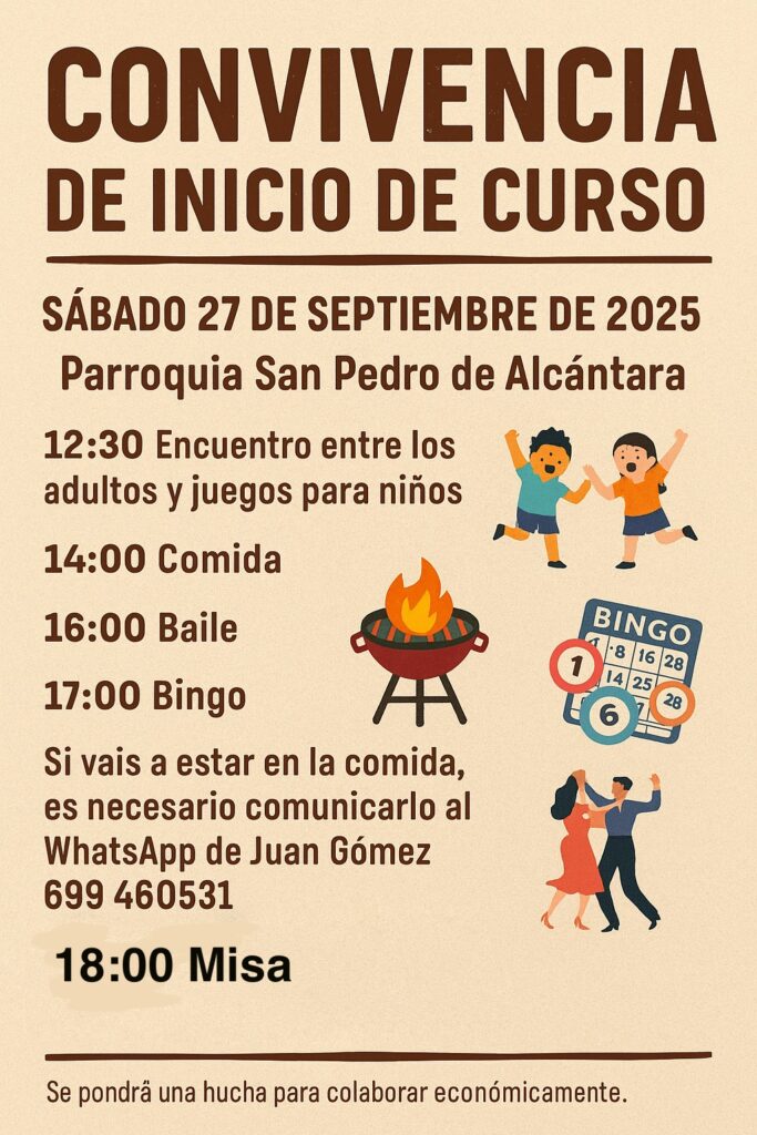 Cáceres, septiembre de 2025 – La comunidad parroquial de San Pedro de Alcántara volverá a vibrar este sábado 27 de septiembre con una de sus citas más entrañables: la convivencia de inicio de curso pastoral 2025–2026, una jornada abierta a todos los vecinos y feligreses, donde se entrelazan la alegría, el encuentro fraterno y la celebración compartida de la fe.