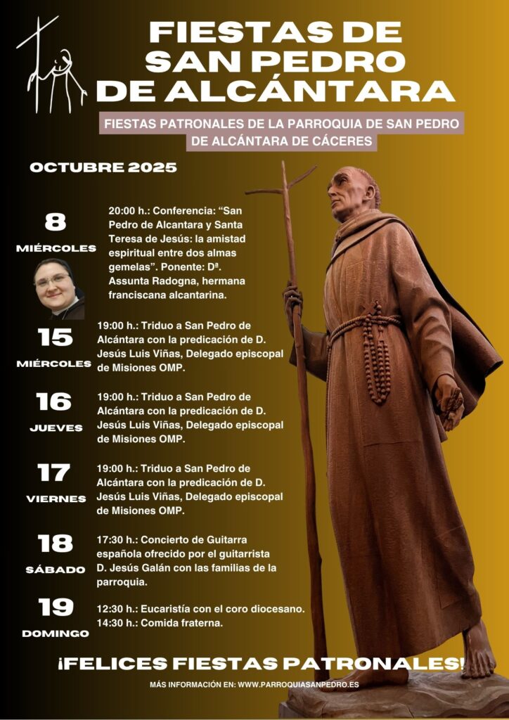 El programa de fiestas incluye, además, el solemne triduo y las eucaristías en honor al patrón, que reunirán a toda la comunidad en torno a la fe y la devoción a San Pedro de Alcántara. Como cada año, estas celebraciones ponen el acento en la espiritualidad y el legado del santo, cuya figura sigue siendo inspiración para la vida cristiana de la parroquia y de toda la diócesis.
